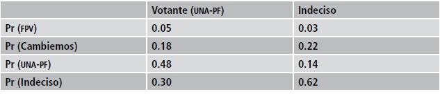 Si traducimos estos resultados a probabilidades, podemos notar que el votante modal (típico) del Frente Renovador (Massa) tanto como el indeciso típico son más parecidos al votante de Cambiemos (Macri) que al votante del Frente para la Victoria (Scioli).