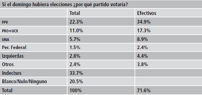 Si los votos de quienes respondieron que "no sabían" por quién votar se hubiesen distribuido proporcionalmente a los de quienes tenían clara su elección, el FPV hubiese alcanzado la victoria en primera vuelta (46.7%).38 No obstante, tal como ya fue constatado por diversos analistas -y pudo comprobarse a partir de la diferencia de resultados entre las PASO y las elecciones de octubre- una proporción significativa de indecisos depositó su voto en alguna de las alternativas opositoras.