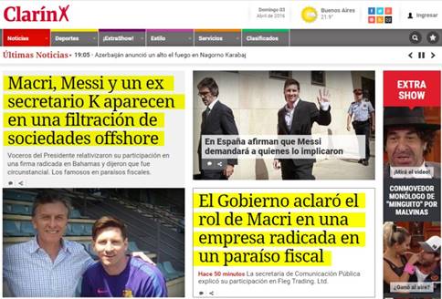 Si bien no es objetivo de este artículo analizar la cobertura de Panama Papers, se considera oportuno mencionar brevemente el caso para reflexionar sobre la necesidad de estudios integrales. La jerarquía o visibilidad que adquirió el presidente en las portadas (tapas) y homepages de Clarín y La Nación fue similar al protagonismo que adquirió el futbolista Lionel Messi y un secretario del expresidente Néstor Kirchner, quien también aparecía en el listado. Presentamos las homepages del día 3 de abril y las portadas (tapas) de los días 4 y 5 de abril.