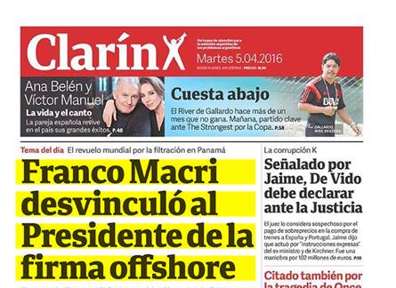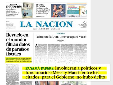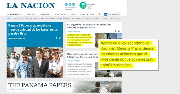 Uno de los mandatarios que figuró en los Panama Papers fue el presidente argentino Mauricio Macri, quien asumió su gobierno el 10 de diciembre de 2015. Ahora bien, la cobertura que hicieron los grandes medios argentinos, como Clarín y La Nación,63 recibió fuertes críticas de medios internacionales tanto por los “sesgos” y la “protección” que se le dio al primer mandatario -a pesar de ser un tema tan sensible para la opinión pública local-64 como por la demora en publicarlo.