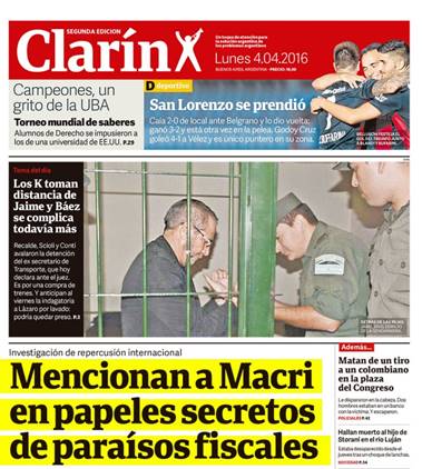 Clarín, 4 de abril de 2016. Portada disponible en < Portada disponible enhttp://tapas.clarin.com/tapa.html#20160404> [fecha de consulta: 12 de junio, 2017].