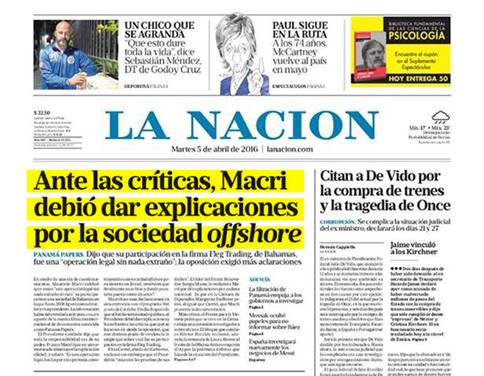 La Nación, 4 de abril de 2016. Portada disponible en < Portada disponible en http://www.diarios-argentinos.com/buscar_tapa.php?fecha_portada=2016-04-04&nombre_diario=La+Nacion> [fecha de consulta: 12 de junio, 2017].