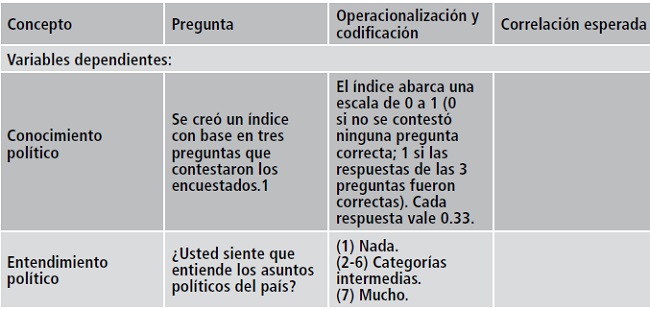 Más de 1 000 personas fueron encuestadas.38 Las variables dependientes son el conocimiento y el entendimiento sobre los asuntos políticos. En ambos casos, la variable independiente clave es la frecuencia con la que los encuestados siguen las noticias de los medios de comunicación. Las variables control son: la participación en las asociaciones políticas de los entrevistados, el interés político de los encuestados, la ideología y las variables socio-demográficas como la edad, la educación, el ingreso y el género. El Cuadro 1 muestra cómo se hicieron operativas dichas variables: