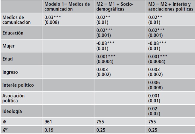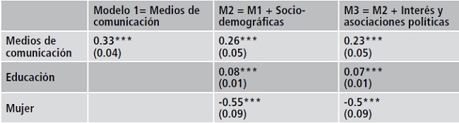 El análisis del Cuadro 3 presenta tres modelos econométricos de tipo MCO. Comienza con un modelo base (modelo 1), en el cual el entendimiento político es explicado exclusivamente por la variable medios de comunicación. Como se puede observar, la variable es significativa con un nivel de confianza de 99 %. Cuando la frecuencia con la que los encuestados siguen las noticias en los medios aumenta una unidad, el entendimiento político aumenta 0.33. Esto revela evidencia en favor de la hipótesis dos de este trabajo (H2: A mayor seguimiento de la opinión pública de las noticias en los medios de comunicación, mayor entendimiento de los acontecimientos políticos). Una serie de variables control, que se describen abajo, aparecen en los modelos 2 y 3 para examinar si los efectos de los medios de comunicación sobre el entendimiento político permanecen.
