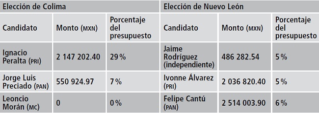 Por último, si bien en Nuevo León, no se observó un sesgo demasiado pronunciado a favor de alguno de los candidatos (como lo hubo en Colima), sí se observó un sesgo de saliencia favorable a los candidatos del PRI y del PAN en uno de los diarios analizados, El Horizonte. En esta misma publicación se encontró un sesgo afectivo desfavorable hacia el candidato independiente. Justamente fueron las campañas del PRI y del PAN las que más invirtieron en la compra de publicidad en diarios, revistas y medios impresos en la elección de Nuevo León.