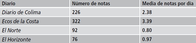 Para llevar a cabo el estudio, se realizó un análisis de contenido de los artículos de primera plana de los dos periódicos locales de mayor tiraje en cada entidad, de acuerdo con el Padrón Nacional de Medios Impresos de la Secretaría de Gobernación. Estos periódicos fueron, por Colima, Diario de Colima (24 450) y Ecos de la Costa (13 155); por Nuevo León, El Norte (131 138), y El Horizonte (89 999). Asimismo, se hicieron comparaciones entre los periódicos y entre las campañas analizadas, en cuanto a la cantidad total de notas, el sesgo de cobertura, el sesgo de saliencia y el sesgo afectivo.