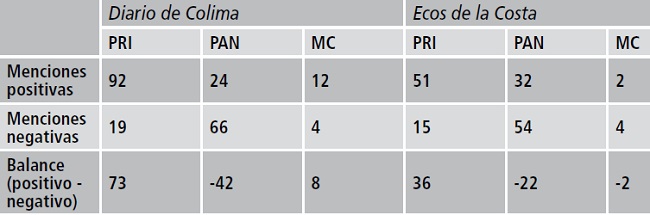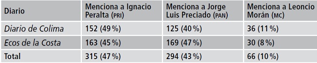 En el estado de Colima, el candidato del PRI tuvo ligeramente más menciones que su contrincante más cercano. La diferencia más pronunciada puede observarse en el Diario de Colima, cuya cobertura favoreció al candidato del PRI. Esto puede apreciarse en la Tabla 3.