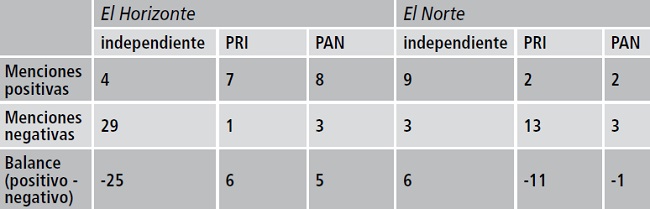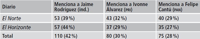 En Nuevo León, el candidato independiente fue el más mencionado. La diferencia en cobertura más importante se observó en el diario El Horizonte, que favorecía a Jaime Rodríguez (ind.). Estas observaciones se describen en la Tabla 4.