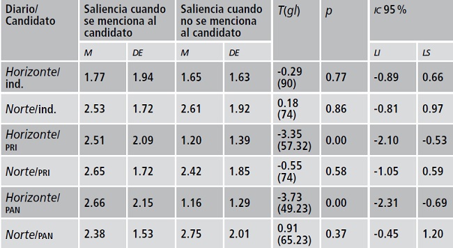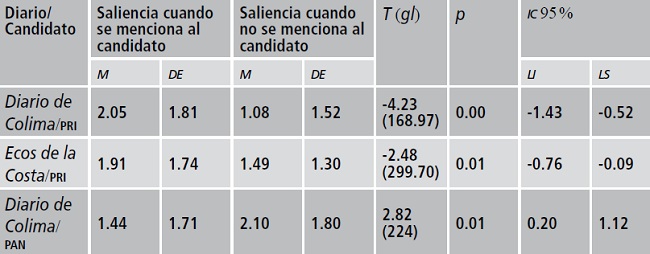 En lo que respecta a los resultados de la escala de saliencia, en la elección de Colima las notas más sobresalientes en primera plana fueron las que mencionaban al candidato del PRI, con una puntuación media en la escala de 1.98 (DE = 1.77). Las notas que mencionaban al candidato del PAN tuvieron una puntuación media de 1.59 (DE = 1.55), y las que mencionaban al candidato de MC tuvieron una puntuación media de 1.58 (DE = 1.62). Para determinar la ocurrencia o no de un sesgo, se comparó la saliencia de las notas que mencionaban a un candidato determinado contra las notas que no lo mencionaban en cada uno de los diarios observados. Esta comparación se realizó mediante la prueba T de Student, y los resultados para el caso de la elección de Colima pueden observarse en la Tabla 5.