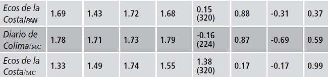 Los resultados muestran que, en los dos diarios analizados en Colima, las notas en que aparecía el candidato del PRI eran más sobresalientes que aquéllas que no lo mencionaban. Por otra parte, para el Diario de Colima, las notas en las que era mencionado el candidato del PAN eran menos sobresalientes que las que no lo mencionaban.