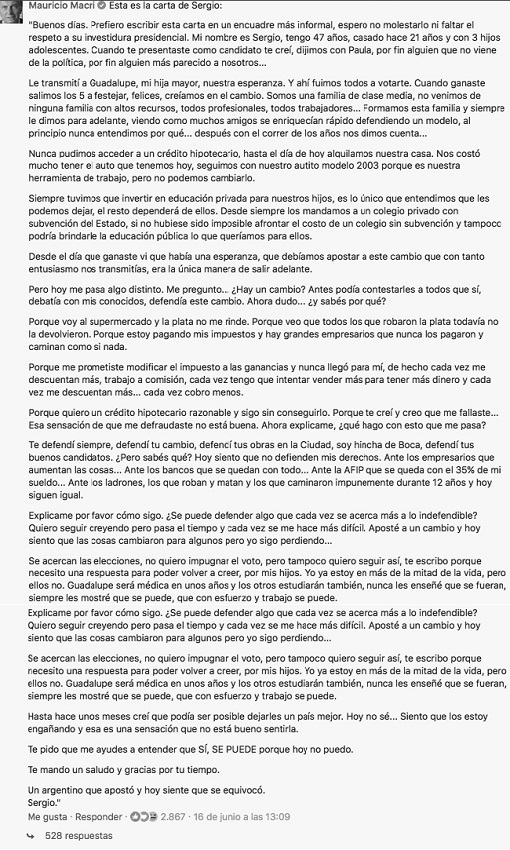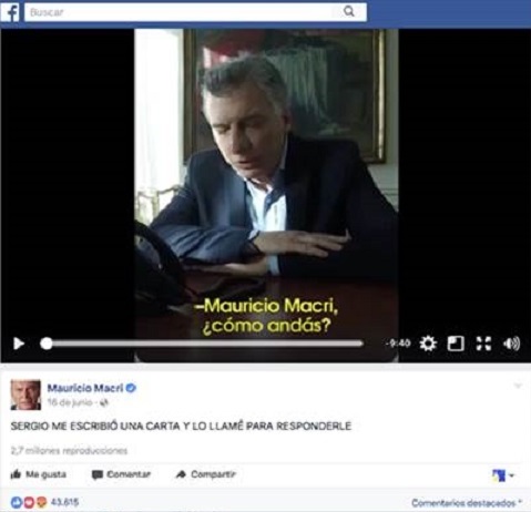 Macri, Mauricio, “Sergio me escribió un carta y le llamé para responderle”, [actualización de estado en Facebook], 16 de junio, 2017. Disponible en <https://www.facebook.com/mauriciomacri/videos/10155521458758478/?hc_ref=ARRcnh9k5puG8-Sh9lEdB7fqyMJL8uKkNDC5GGeonNxTQtagTqZ9yC63bZqPyLWrpdU&pnref=story>, [fecha de consulta: 15 de septiembre, 2017 ].