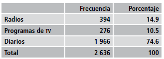 Los diarios son los medios de comunicación que utilizan mayormente las plataformas sociales, y tienen mayor presencia en Facebook que en Twitter. Los programas de televisión denotan un comportamiento diferente: su presencia es mayor en Twitter. Las radios, en cambio, poseen un comportamiento similar en ambas redes sociales. Su presencia no es muy significativa desde el punto de vista de su oferta.