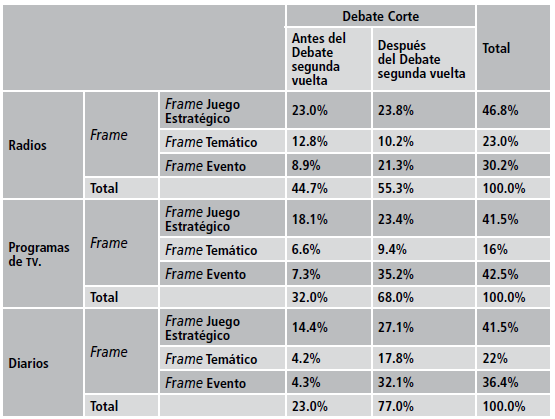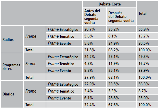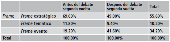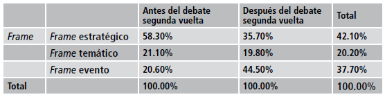 No obstante, los frames temáticos no sufren ninguna variación; tienen una misma proporción antes y después del debate. Aun cuando el debate sea un hecho importante en la agenda de los medios, esto no se observa de modo fehaciente en los frames postdebate. Ello nos hace pensar que, si bien los medios esperan el debate, su prioridad no está en plantear, presentar o discutir lo que ahí se propone; más bien parece que el debate es un episodio más del proceso electoral.