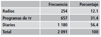 A fin de analizar los frames generados en las redes sociales, se ha establecido observar tres tipos de medios: diarios, radios y televisión. Entre los diarios, se seleccionaron los seis medios con la mayor cobertura: El Comercio, Perú 21, La República, Correo, Exitosa y Trome; entre las radios, se escogieron dos emisoras: Radio Capital y Radio Programas del Perú, y entre las ofertas de la televisión, se seleccionaron tres programas: Cuarto Poder, Día D y América Noticias.38