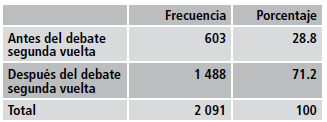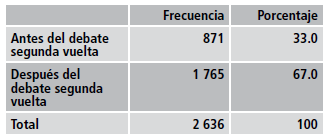 El debate en segunda vuelta sí condiciona a que la cantidad de posts y tuits con carácter electoral se incremente después. El debate propicia que los medios de comunicación dispongan de mayor información, hechos y circunstancias, las cuales presentan a la audiencia en los diferentes encuadres.