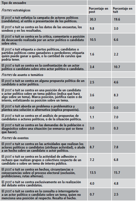 En Facebook, es notorio que el tipo de encuadre más utilizado enfatiza la campaña de actores políticos (30.3%), seguido del post centrado en los hechos del proceso electoral (13.5%) y del centrado en la crítica o comentario de un actor político sobre otro (10.5%); es decir, lo estratégico destaca frente al resto. Como puede apreciarse, las diferentes categorías de frame temático no están muy presentes.