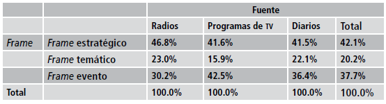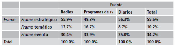 Al hacer el análisis por cada tipo de medio, se observa que en Facebook se privilegian los frames estratégicos, que poseen ciertas diferencias que no llegan a ser significativas. En cuanto a los frames de eventos, los tres tipos de medios tienen una misma proporción. En relación con los frames temáticos, se aprecia que las radios y los programas de televisión son los medios que propician un poco más de este tipo de información.