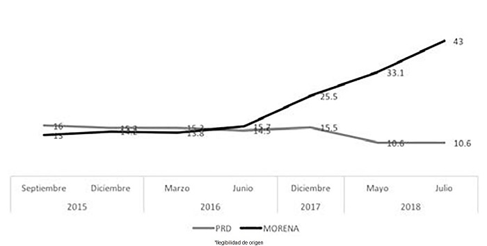 En un período de poco más de tres años, entre septiembre de 2015 y julio de 2018, la identificación partidista con el Movimiento de Regeneración Nacional creció en más de 230%. La emergencia y crecimiento de este partidismo supuso el desalineamiento perredista que después de la elección de Jefe de Gobierno del año 2012 se derrumbó de 40% a 16% en 2015, para no volver a sobrepasar niveles mayores a los 14 puntos en promedio.