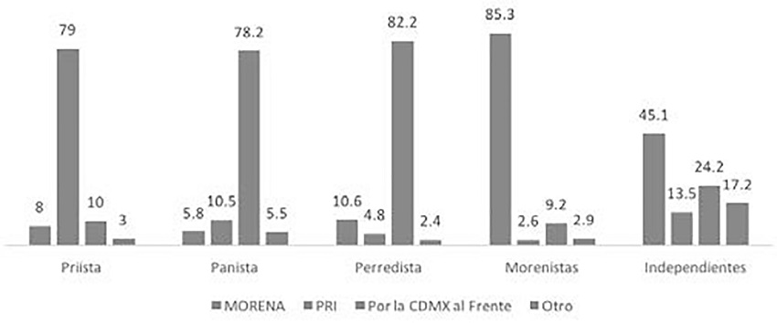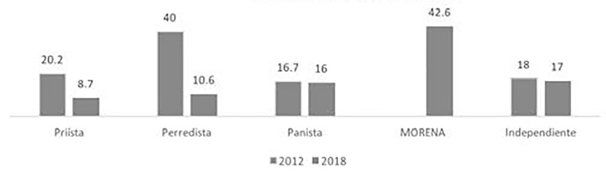 Esto se ve reflejado tanto de forma paulatina como en el lapso de un proceso electoral a otro. Por ejemplo, de acuerdo con distintas mediciones realizadas por el periódico El Universal, en septiembre de 2015, un año después de obtener su registro como partido político nacional y de haberse celebrado las elecciones intermedias en el nivel nacional y local,6 MORENA reportaba, entre los habitantes de la Ciudad de México, 13% de identificación partidista; para mayo de 2018, la identificación partidista era de 33%; finalmente, en julio de 2018, conforme a los datos de la encuesta de salida realizada por el Laboratorio de Innovación Política (LIP) para el proyecto de investigación Dinámicas del comportamiento político electoral en la Ciudad de México: 2000-2018, los niveles de partidismo morenista eran de 42.6%, dato que, por sí mismo, es de suma relevancia, si se considera que seis años antes este partido político no existía en la capital del país.