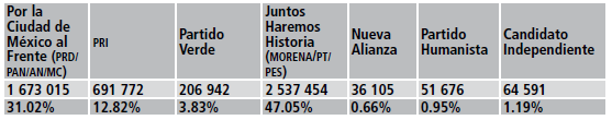 El 1 de julio de 2018 el Movimiento de Regeneración Nacional (MORENA) triunfó en las seis elecciones de carácter concurrente que se llevaron a cabo en la Ciudad de México. Considerando los cargos que se disputaron en la entidad, tres de carácter local y tres de carácter federal, MORENA obtuvo, en promedio, en la capital del país, 50% de la votación total efectiva; es decir, más de 2 627 925 votos.2