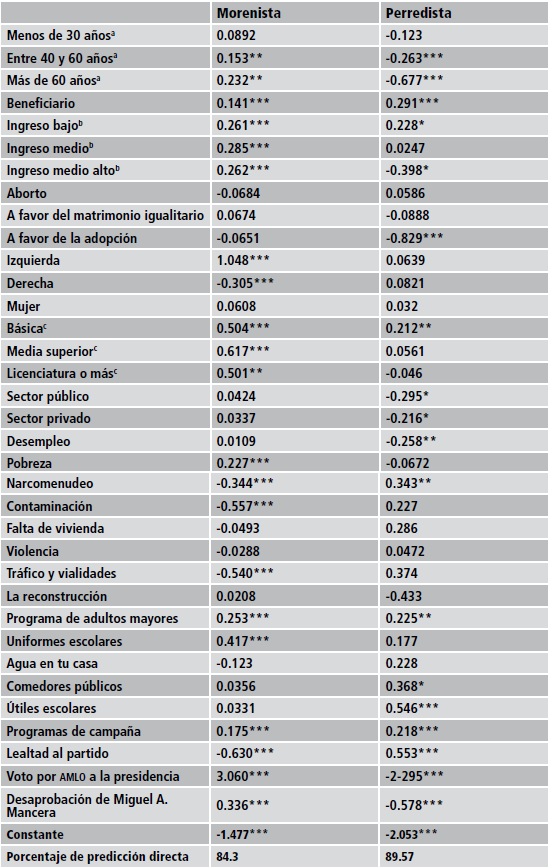 El género no fue significativo para predecir el perredismo y el morenismo; sin embargo, las probabilidades de ser mujer y hombre y ser perredista son menores frente a ser partidario de MORENA; en el primero caso, el contraste contrapone 0.44 con 0.09 y, en el de los hombres, 0.42 con 0.10.