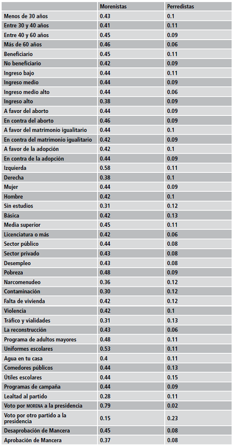 Aunado a lo anterior, las consideraciones de tipo normativo como el matrimonio igualitario, la adopción entre personas del mismo sexo y la legalización de la mariguana, entre otras ya señaladas, propias de una ideología de izquierda, la cual ya ni siquiera es predictora del perredismo, no representan una relevancia significativa para explicar la IPMOR.
