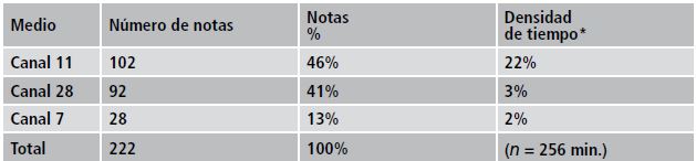 En términos generales, si se contempla el número de mensajes presentados en los tres noticiarios de televisión, pareciera que cada uno transmitió en promedio cuatro notas por día. Sin embargo, lo cierto es que cada uno de los informativos adoptó una política editorial muy diferente en cuanto a la cantidad y al tiempo brindados al acontecimiento.