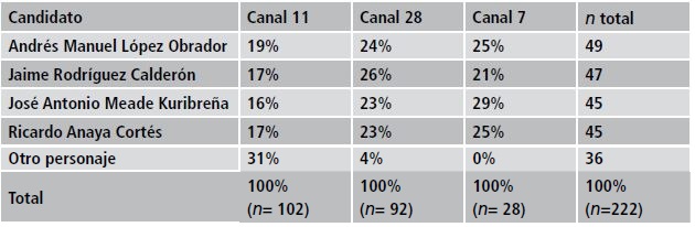 Sin embargo, vistos desde una perspectiva particular, es posible reparar en que cada uno de los informativos participó de manera diferente, sobre todo, los vinculados a los sistemas regionales de Jalisco y Nuevo León, los que se enfocaron principalmente en difundir eventos donde participara alguno de los candidatos. Como resultado de esta política editorial, se destaca el limitado número de actores a los que se les brindó acceso a sus pantallas. En Canal 28, la presencia de personajes distintos a los candidatos representó 4%, y en Canal 7, no se presentó ninguno. En Canal 11, la situación fue distinta, ya que un tercio de los actores estuvo conformado por otros personajes e instituciones (38%).