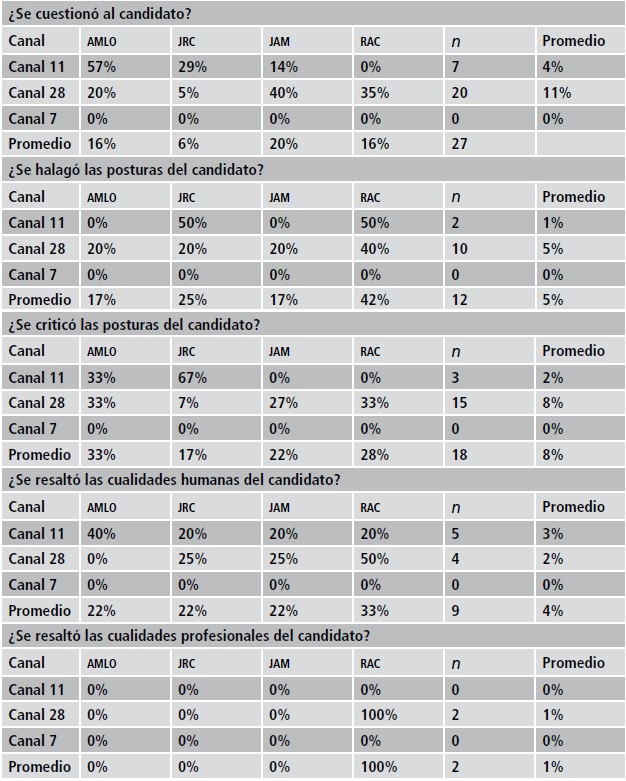 Al presentar a los candidatos, los informativos se condujeron de manera ecuánime, sin dañar o beneficiar la imagen de ninguno de los ellos. Se utilizaron pocos adjetivos negativos para describir sus acciones y, sólo en poco menos de 5% de las notas, se halagó alguna postura. Fueron también pocas las ocasiones en las que se destacaron las cualidades humanas (4%) o profesionales (1%) de alguno de ellos (Tabla 3). Pocas veces se le preguntó algo a alguno de los candidatos. Fue Canal 11 el que más participó de estos ejercicios. En su noticiario, se incluyeron siete notas en donde se puede detectar -explícitamente- lo anterior. Sin embargo, nunca se trató de manera particular a alguno de los candidatos.