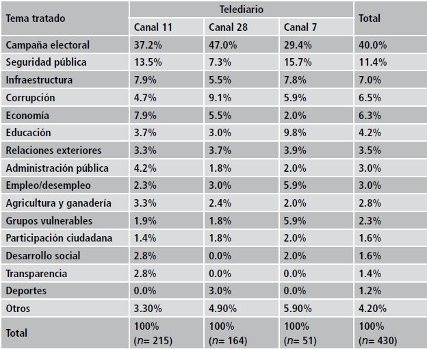 Si se considera la participación de los tres noticiarios, la muestra arrojó 430 temas; es decir, cada día se presentó 10 contenidos diferentes al público mexicano. Sin embargo, existen dos aspectos por destacar. El primero tiene que ver con que la mayoría de los temas que se transmitió en los espacios informativos centró su atención en tan sólo 5 temas: política partidista, debates, seguridad pública, corrupción, y economía. El segundo aspecto se refiere a que la mayoría de los contenidos se difundió en dos canales de televisión: Canal 11 y Canal 28.