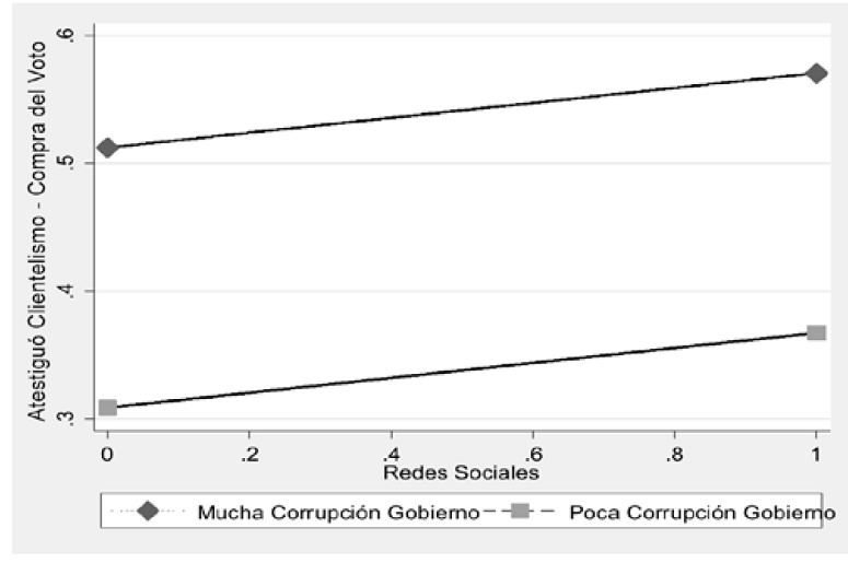 El artículo presenta la Gráfica 2 para ilustrar el impacto de la variable redes sociales en la percepción de la opinión pública sobre el clientelismo o la compra del voto, con el uso de variable corrupción del gobierno como control. Esta gráfica muestra que hay una correlación positiva entre la variable independiente y la variable dependiente. Cuando una persona afirma obtener información política por medio de las redes sociales, aumenta la oportunidad de haber atestiguado el clientelismo o la compra del voto; sin embargo, se evidencia que este efecto no es homogéneo cuando agregamos como variable control la opinión del ciudadano sobre la corrupción en el gobierno. El uso de las redes sociales afecta positivamente el hecho de haber atestiguado el clientelismo o la compra del voto, pero este efecto es mayor entre quienes piensan que hay mucha corrupción en el gobierno (la línea superior de la gráfica), ya que la oportunidad de haber atestiguado la entrega de regalos, favores o dinero resulta mayor que con quienes consideran que la corrupción en el gobierno es poca (la línea inferior de la gráfica).