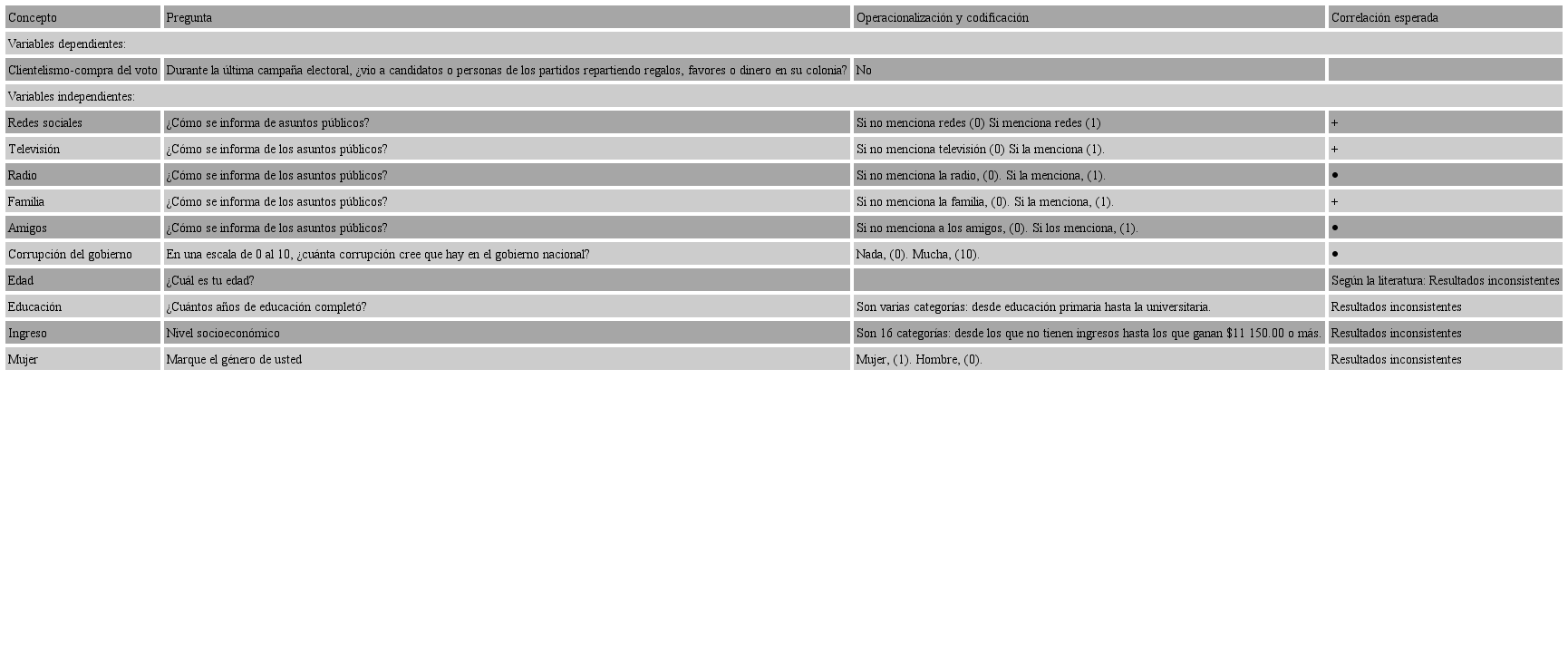 El análisis de este artículo se basa en el estudio de 2017 de Latinobarómetro,43 que incluye datos de encuestas realizadas en 18 países de América Latina. El presente trabajo retoma exclusivamente la encuesta realizada en México, debido a su objeto de investigación: el papel de las redes sociales para alertar a los ciudadanos acerca del llamado clientelismo y la compra del voto en la elección presidencial de 2018. Es una encuesta representativa, en el nivel nacional, de adultos en edad de votar. Se llevó a cabo a través de entrevistas cara a cara; la muestra fue desarrollada utilizando un diseño probabilístico multietápico por conglomerados (con cuotas en el nivel del hogar), y fue estratificada por regiones, tamaños de los municipios y por zona urbana y rural dentro de cada municipio. Aproximadamente, 1 200 personas fueron encuestadas.44 La variable dependiente es si los encuestados vieron a los candidatos o personas de los partidos políticos repartiendo regalos, “favores” (clientelismo) o dinero (compra del voto) entre la población. Esta pregunta permite medir tanto el clientelismo (intercambio no monetario: regalos, favores) como la compra del voto (intercambio monetario, dinero). El Cuadro 1 muestra todas las variables y su operatividad.