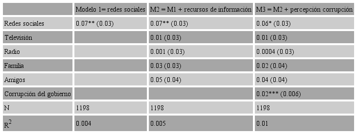En el último modelo, el número tres, se agrega otra variable, la percepción de la opinión pública sobre la corrupción en el gobierno. A pesar de los fuertes efectos de esta variable (99% de nivel de confianza sobre la variable dependiente), las redes sociales siguen teniendo efectos significativos en la opinión ciudadana sobre el clientelismo y la compra del voto, con 90% de significancia. El fuerte impacto que tiene la percepción sobre la corrupción fortalece la hipótesis cuatro de este trabajo (H4: quienes han tenido una visión más negativa sobre la corrupción existente en el gobierno gozaron de mayor éxito en detectar el clientelismo o la compra del voto por parte de los candidatos a un puesto de elección popular y de los partidos políticos que quienes no lo hicieron). El cuadro dos muestra las principales variables que permiten explicar la visión de la opinión pública sobre la compra del voto: las redes sociales y la percepción sobre la corrupción del gobierno. Ambas variables fortalecen la capacidad de la ciudadanía para monitorear a los candidatos y a los partidos políticos involucrados en la entrega de favores, regalos y dinero a los votantes. En contraste, los medios electrónicos (radio y televisión) y la interacción cara a cara (con amigos y familiares) no tienen un fuerte impacto.