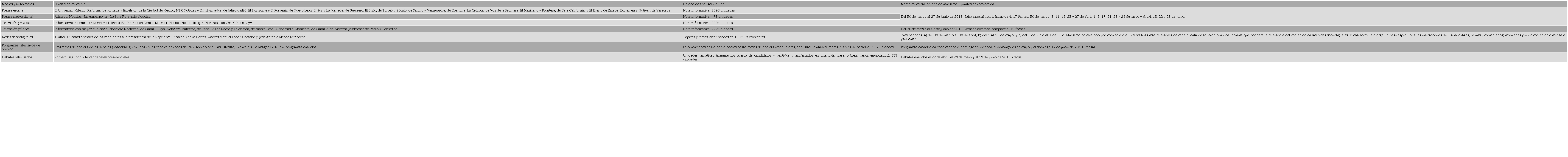 Por otro lado, se utilizó un libro de códigos unificado para todos los formatos analizados, haciendo ajustes en aquellos que lo requerían. Siguiendo la literatura citada, así como los ordenamientos constitucionales y reglamentarios mexicanos que hemos mencionado, determinamos seis criterios de desempeño y, a partir de ahí, especificamos ocho variables. Así, dentro de los criterios establecidos en los documentos legales mencionados, medimos el de imparcialidad, en términos de equidad partidista tanto en la variable tratamiento editorial (1) (favorable, desfavorable, neutral) como en la de visibilidad (2) (número y proporción de unidades emitidas para cada candidato, trátese de notas, tuits, opiniones, etcétera), así como el criterio de base de información sustanciosa, expresado en las variables de tematización plural (3) y presencia de propuestas de política pública (4). Respecto a los valores de deliberación mediada, incluimos los criterios de entrega de razones (5), expresado en una variable que indica si en las unidades se argumentan las posiciones de los candidatos; pluralidad de voces (6), patente en la diversidad de los actores que protagonizan las notas;16civilidad (7), manifiesto en la ausencia de expresiones despectivas, y responsividad (8), expresado en la presencia de posiciones opuestas dentro del mensaje. Salvo las variables de imparcialidad, tematización plural y pluralidad de voces, las demás son de naturaleza dicotómica, y constatan si dicha condición se cumple o no.
