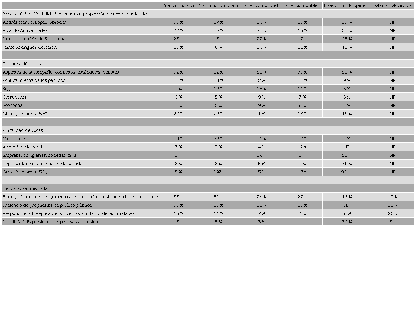 Por otro lado, los indicadores reducidos de deliberación mediada pueden revelar una lógica eficientista de producción de información, preocupada por la cantidad antes que por la calidad; a esto se suman las limitaciones estructurales, tanto económicas como de profesionalización, de los medios mexicanos. En efecto, el hecho de que la prensa nativa digital y la televisión pública tengan desempeños semejantes a la prensa impresa y a la televisión privadas y hegemónicas, a pesar de las potencialidades digitales de la primera y de la independencia comercial de la segunda, sugiere que las rutinas organizacionales de los periodistas son constantes a pesar de que la propiedad y la plataforma tecnológica varíen.