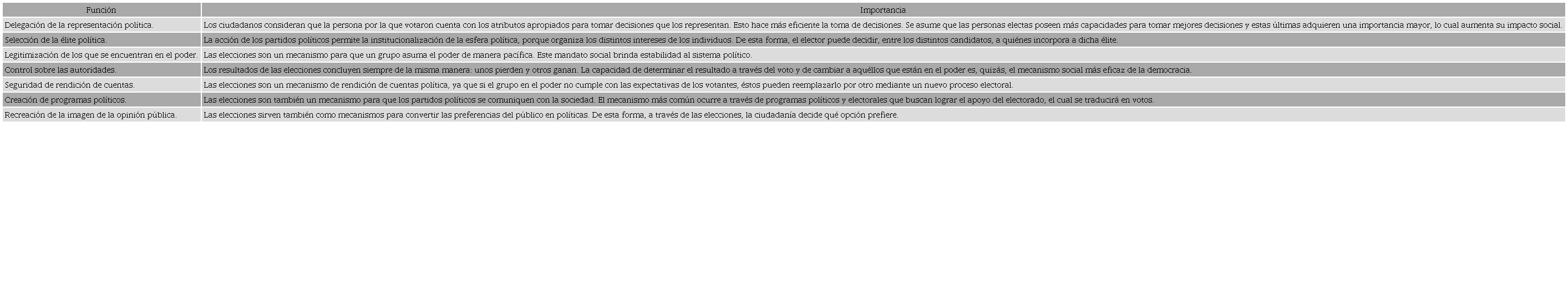 La base de un sistema democrático son las elecciones competitivas, ya que proveen de legitimidad al ejercicio de la autoridad pública y a las decisiones de ésta, las cuales deben reflejar los intereses de los votantes. Las elecciones en sistemas democráticos tienen distintas funciones, el Cuadro 1 resume siete de las más importantes.11