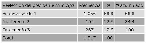 En cuanto a la pregunta: ¿qué tan de acuerdo está usted en la reelección del presidente municipal?, la mayoría (69.6 %) no estaba de acuerdo con la reelección, como se muestra en la Tabla 1.