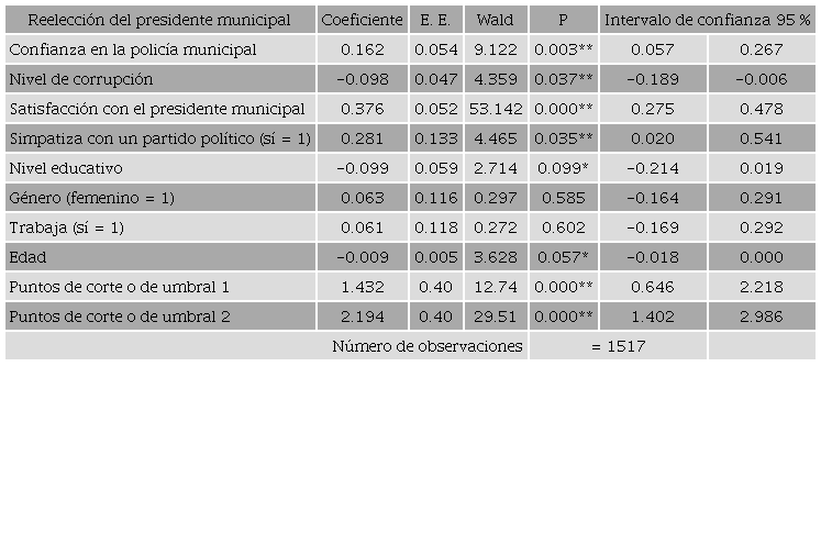 Finalmente, de acuerdo con el resultado de la prueba de líneas paralelas [(2(8gl) = 10.736 y P < 0.217] no se rechaza la hipótesis nula, la cual plantea que los coeficientes son los mismos entre las categorías de respuesta, que es lo que se busca en este tipo de análisis. En suma, el modelo propuesto cuenta con poder predictivo, porque las variables consideradas en el estudio son predictores de la variable dependiente, que en este caso representa la reelección del presidente municipal.