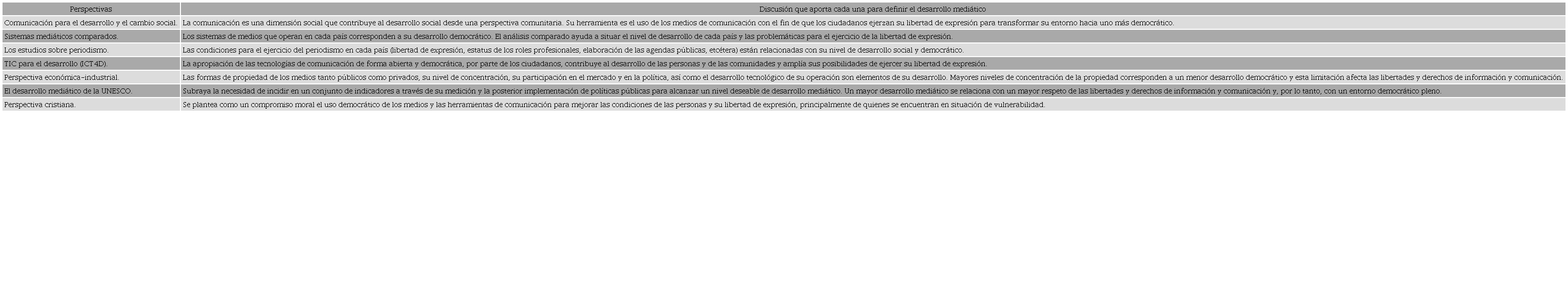 La falta de definición, problematización y precisión del concepto central en dicho documento no significa que carezca de un aparato crítico. Como puede identificarse en su lista de “bibliografía selecta”,27 la formulación se sustenta en las reflexiones de organismos globales (el Programa Internacional para el Desarrollo de la Comunicación; la Cumbre Mundial sobre la Sociedad de la Información y el Banco Mundial, entre otros), organizaciones civiles internacionales (por ejemplo, Article 19, Asociación Mediática de la Mancomunidad, Freedom House), organizaciones mediáticas (Fideicomiso del Servicio Mundial de la bbc, Internews Europa, Unión Internacional de la Telecomunicaciones) y textos de autores académicos, como Pipa Norris.