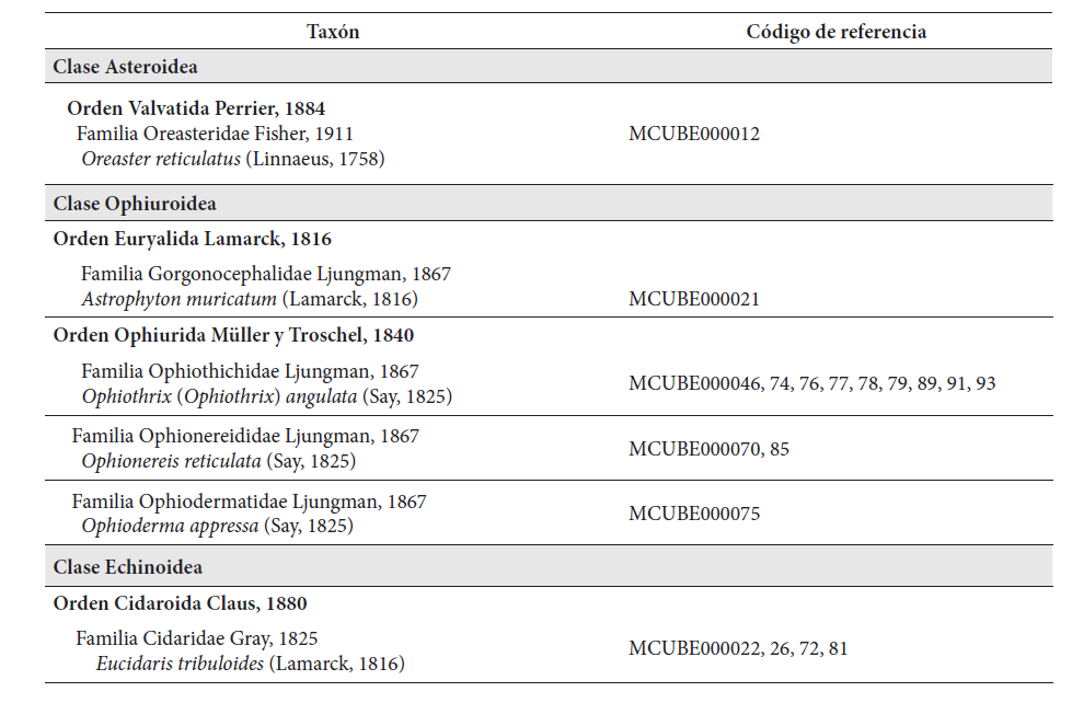 Los ejemplares fueron revisados y determinados usando las claves y guías taxonómicas de Matsumoto (1915), Hernández-Herrejón et al. (2008), Benavides-Serrato et al. (2011), Borrero-Pérez et al. (2012), Gondim et al. (2013, 2014). Para los ejemplares de la clase Holothuroidea se realizaron cortes del tegumento, los cuales fueron depositados en hipoclorito de sodio, una vez extraídos los micro-osículos se usaron las claves de Miller et al. (1984), Rowe (1969), Pawson et al. (2010),Borrero-Pérez et al. (2012) y Olguín et al. (2014), para la determinación. Para la confirmación de las especies se contactaron a los especialistas Carolina Olguín Jacobson y Giomar Borrero en la Clase Holothuroidea y Milena Benavides y Gordon Hendler para las Clases Echinoidea y Ophiuroidea.