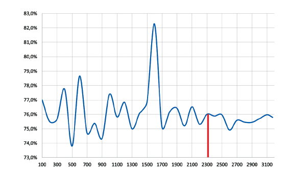 La fluctuación en los niveles de exactitud mostró que alrededor de los 2300 puntos de muestra se estabilizó dentro de un rango en el que la variación es poco significativa con menos del 1 % (Figura 8).