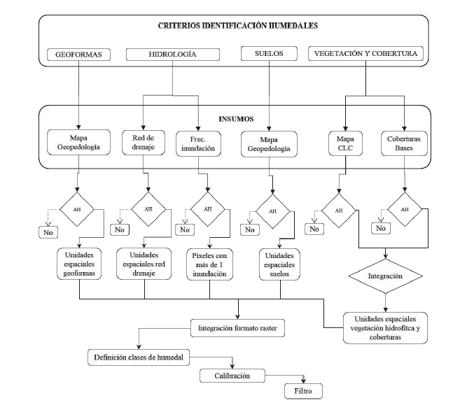 Una vez se contó con cada uno de los criterios de identificación mapeados a nivel nacional, se consolidaron capas en formato raster a 25 m de pixel, teniendo en cuenta que la mayoría de insumos estaban a escala 1:100.000. Además este tamaño de pixel permitió mantener la continuidad espacial de elementos propios de la red de drenaje y la integración con el mapa de frecuencias de inundación. Posteriormente, con la ayuda de herramientas de geoprocesamiento en un software SIG, se integraron sobre la misma grilla nacional, los insumos descritos en el ítem anterior asociando la presencia de humedal, a la superposición espacial de criterios de identificación (Figura 2).