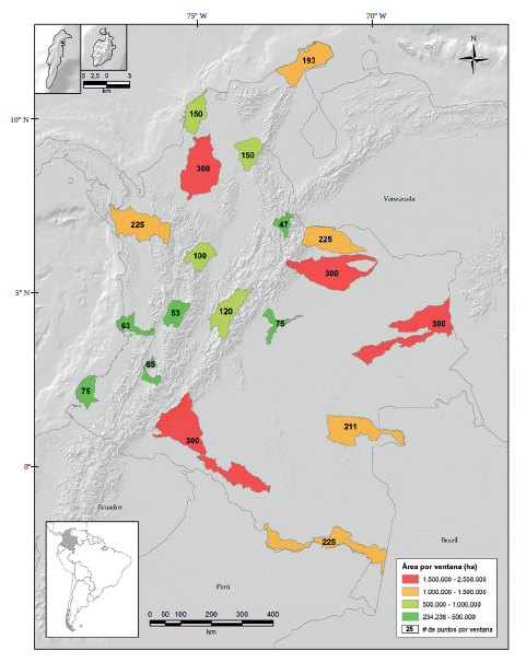 Para garantizar una muestra representativa y resultados confiables en la evaluación de la exactitud temática del mapa se determinó que el área total evaluada debería ser mayor al 10 % del territorio continental del país y por otro lado que fueran representativas de la heterogeneidad geográfica del país. Se seleccionaron 19 ventanas que equivalen al 16 % del territorio continental del país. El número de puntos se calculó siguiendo las recomendaciones de Chuvieco (1995), McCoy (2005) y Meidinger (2003), se fijó una exactitud del 95 % de probabilidad (valor crítico 1,96) y un error máximo permitido de 5 %. Por otra parte, al no contar con información que permitiera inferir a priori el porcentaje de error estimado con objetividad, se determinó un acierto estimado de 50 %. Con base en estos parámetros el tamaño de muestra calculado fue de 384 puntos. Se definió este número como el mínimo para evaluar cada una de las categorías de humedal teniendo en cuenta el área del territorio nacional. Las categorías de potenciales medio y bajo se unieron en una sola clase debido a las limitaciones de los insumos cartográficos para realizar el análisis de manera separada.