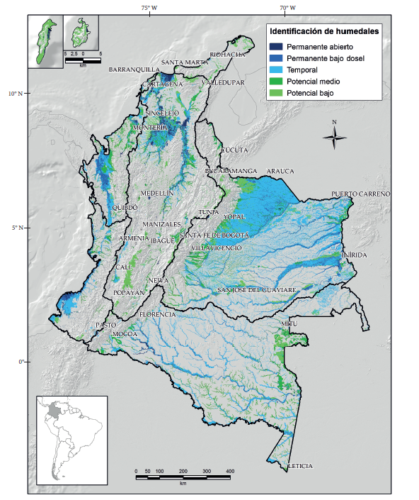 En Colombia se encuentran los trabajos de Marín (1992) y Naranjo (1997), que identificaron los principales complejos de humedales para cada una de las cinco regiones hidrográficas del país. Naranjo et al. (1999), identificaron 27 complejos a nivel nacional siendo la región Caribe una de las más importantes, con el 71 % de las áreas de humedal identificadas. Esta información se convirtió en el marco conceptual y técnico para el desarrollo de la Política Nacional para Humedales Interiores de Colombia del Ministerio de Medio Ambiente (2002), y menciona que Colombia presenta cerca de 20 millones de hectáreas de humedal. Por otro lado, en 2007 el Ideam identificó en el mapa de ecosistemas solamente 12,4 millones de hectáreas relacionadas con ecosistemas acuáticos. Lo anterior indica la variabilidad de las definiciones y metodologías para estudiar estos ecosistemas en el país y la necesidad de contar con una herramienta espacial unificada a nivel nacional, que permita el diseño de políticas y acciones de manejo acorde con la extensión de estos ecosistemas en el país.