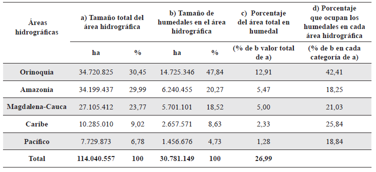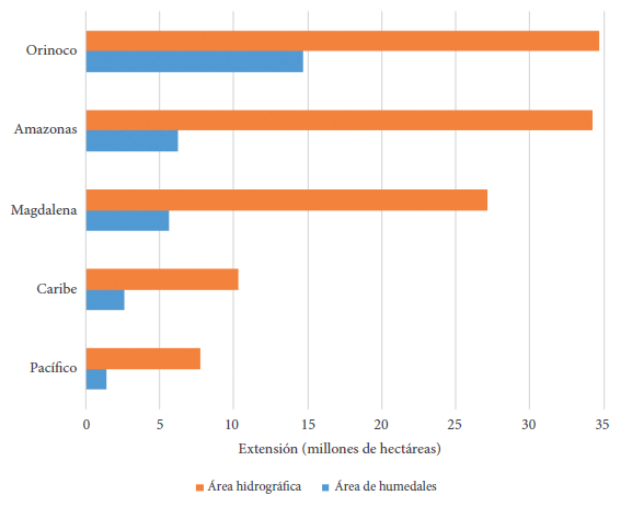 A escala 1:100.000 se identificó un área total de 30.781.149 ha de humedales en todo el territorio nacional, equivalente a un 26,99 % (Figura 4). El área hidrográfica que presenta la mayor cantidad de humedales es la Orinoquia, seguida de la Amazonia y Magdalena-Cauca, mientras que el Caribe y el Pacífico presentan los valores más bajos (Tabla 2). Es de resaltar la relación proporcional entre la extensión de las áreas hidrográficas y sus respectivas áreas de humedales (Figura 5).