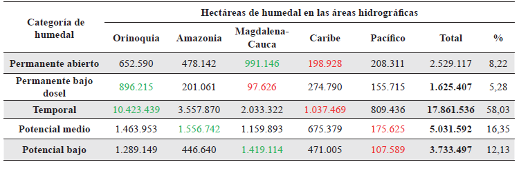 Los humedales de la categoría “permanentes abierto” presenta los valores más altos en el Magdalena-Cauca y los más bajos en el Caribe; la categoría “permanente bajo dosel” presenta los valores más altos en el Orinoco y en el Caribe, mientras los valores más bajos se presentan en el área Magdalena-Cauca.