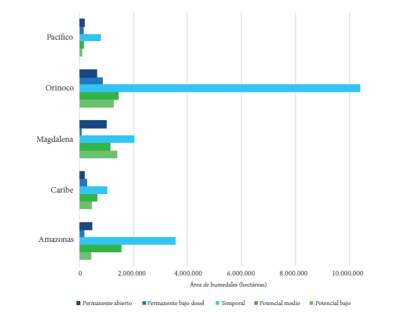 La mayor extensión de la categoría de humedal temporal se encuentra en el área hidrográfica del Orinoco, en los departamentos de Arauca y Casanare, dominados por sabanas inundables con una marcada estacionalidad en la inundación. En ésta área hidrográfica los humedales permanentes bajo dosel, se encuentran localizados principalmente hacia las márgenes de los ríos Inírida, Guaviare y el caño Matavén. El área hidrográfica del Amazonas presenta también grandes extensiones de humedales permanentes abiertos y bajo dosel asociados a las madreviejas y bosques inundables de las márgenes de los ríos Putumayo, Caquetá, Apaporis y Vaupés.