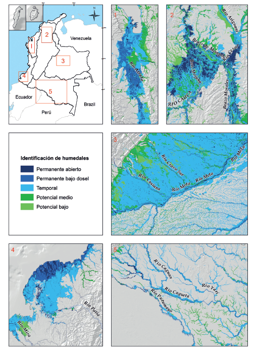 De manera ilustrativa para facilitar la visualización de resultados, se generaron ventanas regionales que permiten visualizar detalles de las categorías de humedal identificadas, estas ventanas son: 1) área hidrográfica del Caribe: cuenca baja del río Atrato; 2) área hidrográfica Magdalena-Cauca: complejo de ciénagas del medio y bajo Magdalena; 3) área hidrográfica de la Orinoquia: desembocaduras de los ríos Cravo Sur y Norte en el río Meta; 4) área hidrográfica del Pacífico: sistemas deltaicos de los ríos Patía y Mira; 5) área hidrográfica de la Amazonia: ríos Caquetá, Vaupés y Putumayo.