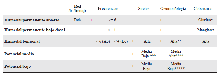 + Equivale a un operador “O” en el proceso aditivo de las capas cartográficas, es decir que solo se debe cumplir con una de las condiciones. Por ejemplo, los humedales permanentes abiertos se definen por la red de drenaje o por frecuencias mayores a seis o por coberturas de glaciar. * Las frecuencias incluyeron todas las zonas en las que se registró más de una inundación y que coincidieron espacialmente con cualquiera de los demás criterios en un grado de asociación mayor a cero. ** GMF en alto nivel de asociación reafirmada con asociación media de suelos. *** Suelos en asociación media reafirmada por niveles medios-bajos de asociación de geomorfología, o suelos en asociación baja reafirmada por niveles medios de asociación de geomorfología. **** GMF alta sin estar necesariamente reafirmada por suelos o media reafirmada por niveles medios o bajos de asociación de suelos. ***** Aquí los niveles de asociación fueron medios o bajos en una sola variable, ya fuera geomorfología o suelos, o bajosen las dos variables simultáneamente.Los humedales temporales estuvieron determinados principalmente por las coberturas vegetales asociadas a humedales y las frecuencias de inundación cuando los pixeles presentaron un número de inundaciones por debajo del umbral definido en los humedales permanentes. En este tipo de humedales también se incluyeron las zonas en las que los suelos o la geomorfología presentaron una alta asociación con humedales y que no fueron incluidos en los permanentes.