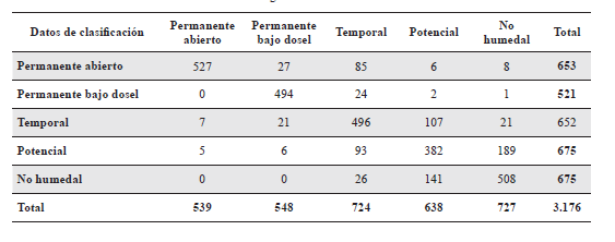 En el proceso de calibración del mapa, se revisaron un total de 1893 puntos. El 76 % confirmaron las zonas identificadas como humedal en el mapa y el 24 % correspondió a áreas que fueron revisadas y ajustadas. Como resultado del proceso de evaluación de la exactitud del mapa, se analizaron un total de 3176 puntos distribuidos de manera similar en cada categoría de humedal (Tabla 4). La exactitud temática calculada para el mapa fue de 75,79 % con un intervalo de confianza de 1,5 %, lo que indica que se puede esperar con un 95 % de probabilidad que la exactitud se encuentra entre 77,3 y 74,3 %. El estimador Kappa fue de 0,6968 lo que corresponde, de acuerdo a la escala de Landis y Koch (1977), a un nivel de concordancia sustancial.